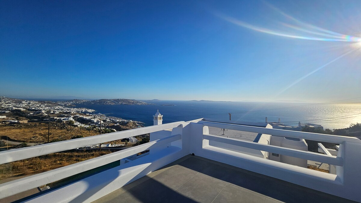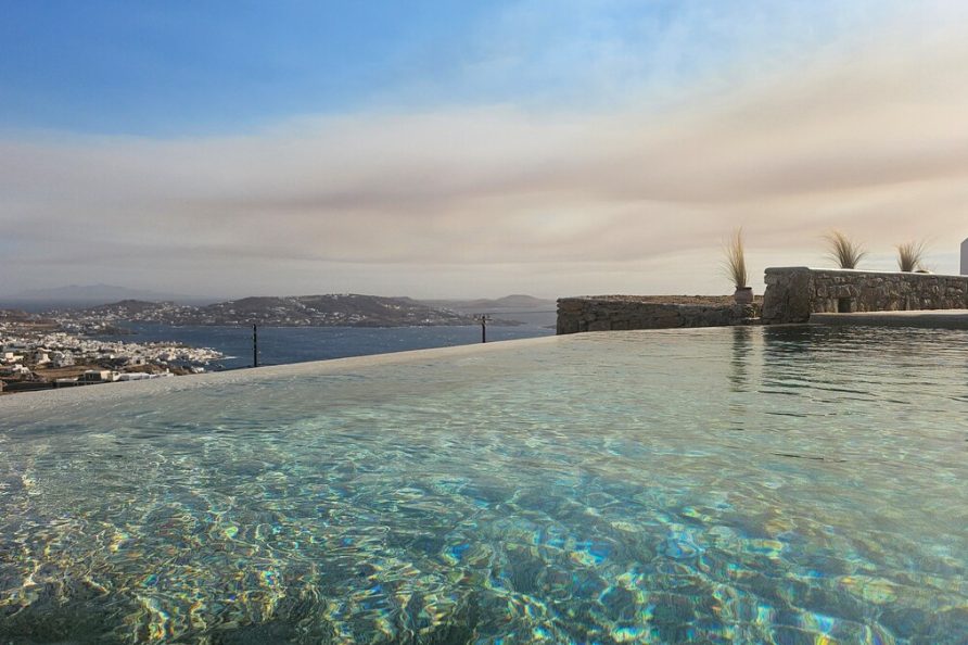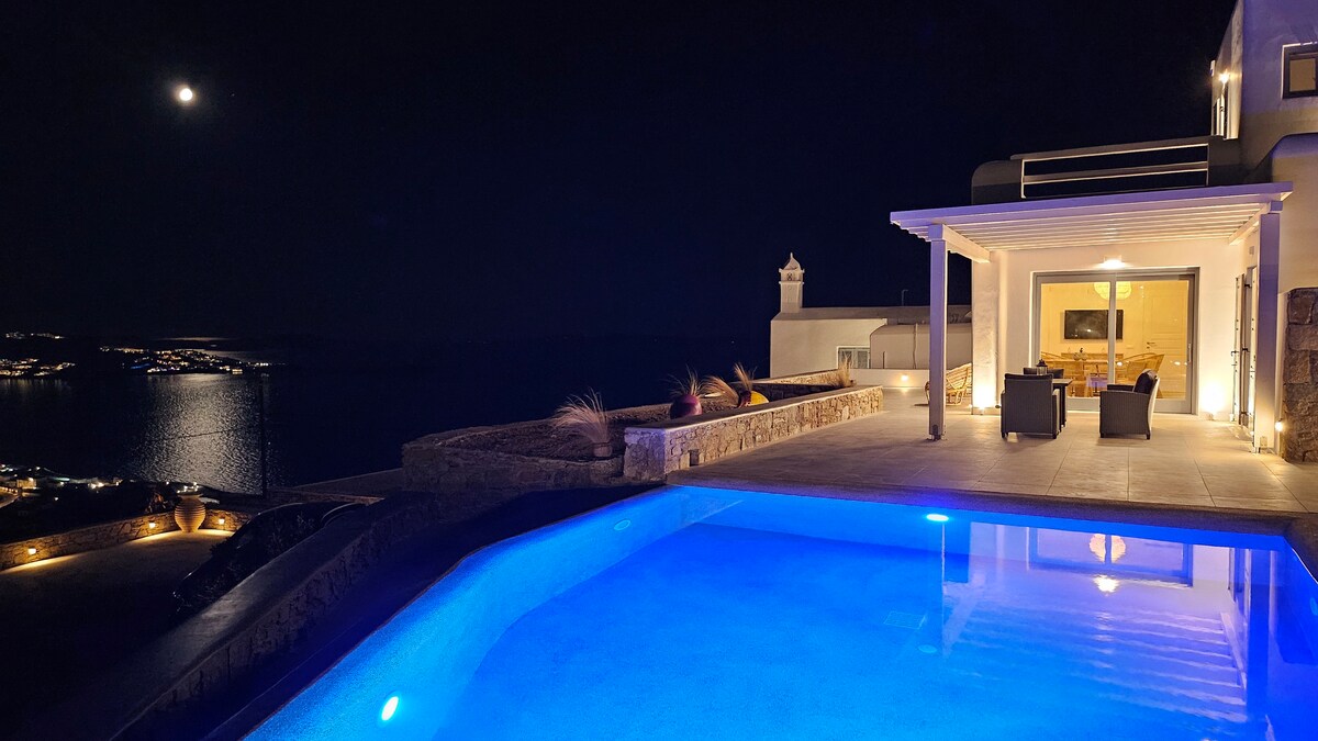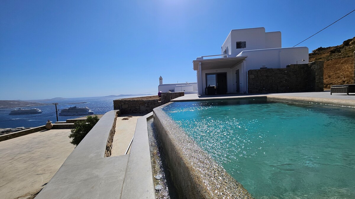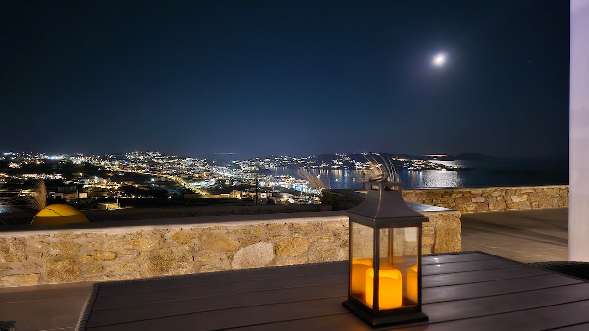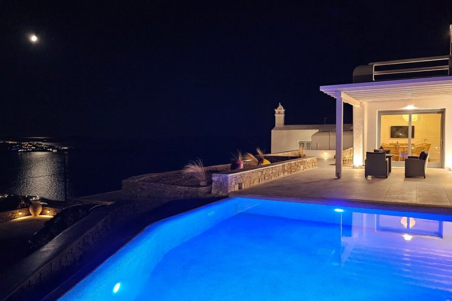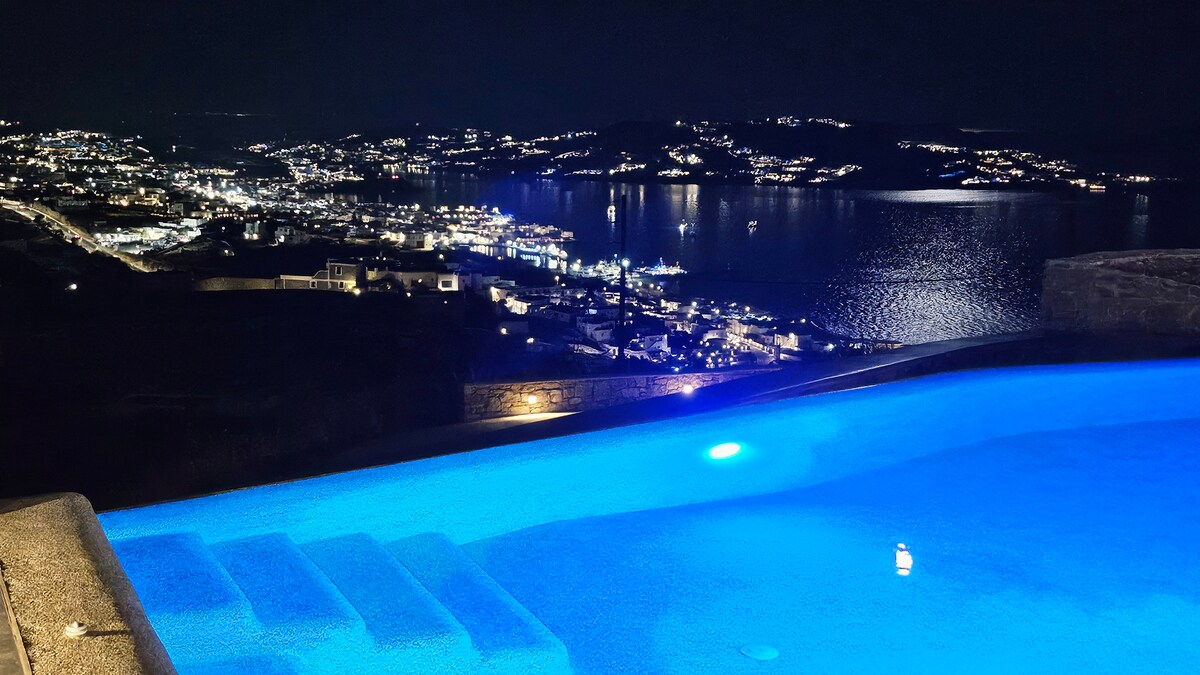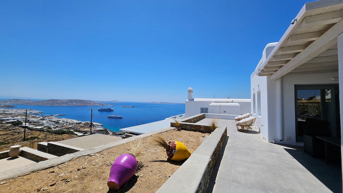The villa boasts stunning panoramic views of Mykonos Town, the iconic Windmills, Little Venice and the Aegean Sea, while its proximity to the New Port adds extra convenience for guests.